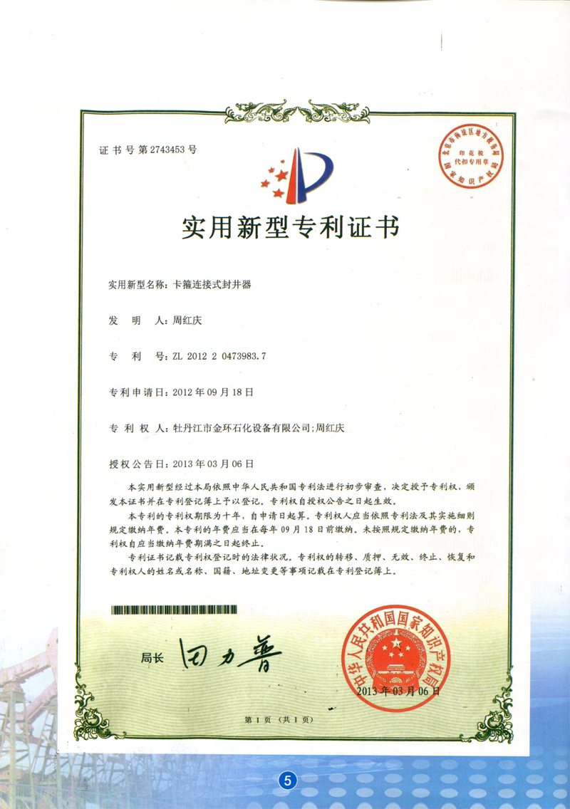 卡箍連接式封井器實用新型專利證書ZL 2012 2 0473983.7